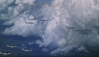 An incredible atmospheric shot of B-47s streaking through the clouds.
